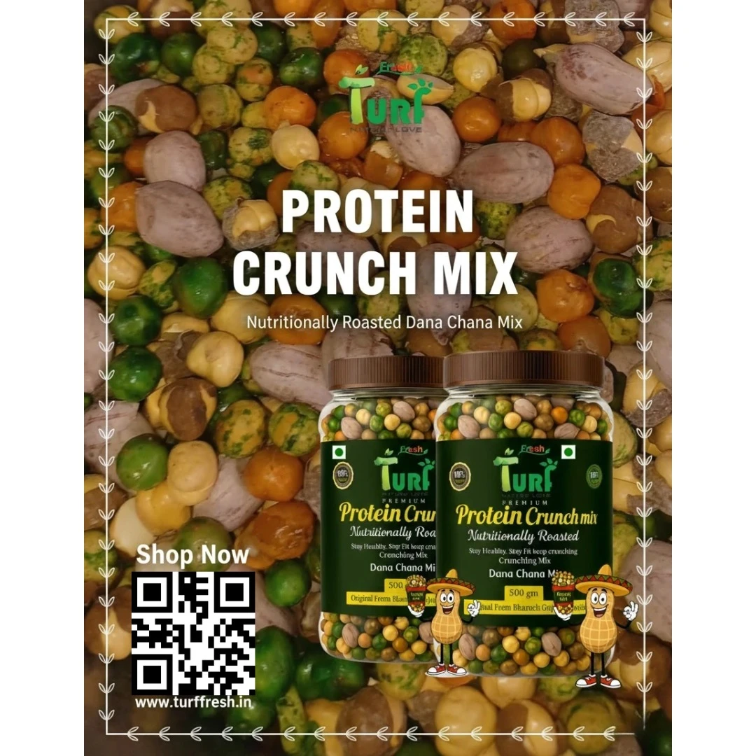 Enjoy the authentic taste of Bharuch with Turf Fresh Premium Protein Crunch Mix, a delicious and nutritious blend of roasted dana and chana. Carefully selected high-quality chickpeas and green peas are perfectly roasted to deliver a rich crunch and natural flavor in every bite. This wholesome snack is packed with plant-based protein, fiber, and essential nutrients, making it an ideal choice for health-conscious individuals.